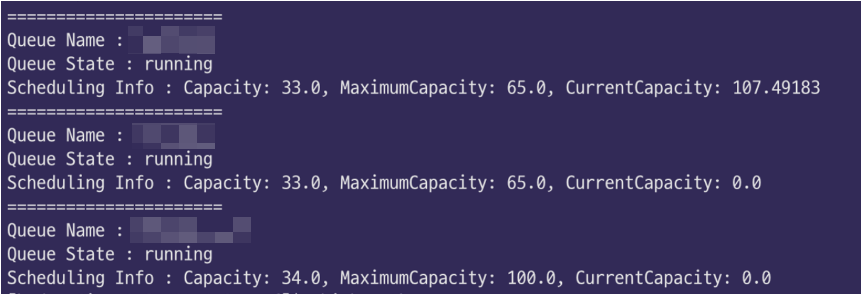 - mapred queue -list 명령어를 사용하면 현재 사용중인 큐의 scheduling info를 살펴볼 수 있는데, current capacity가 100을 넘는 것을 볼 수 있다. 처음에 MaximumCapacity보다 더 많이 사용하고 있는 줄 알고 놀랬는데, current capacity에 대한 정의가 달랐다. 만약 current capacity가 아래와 같이 107이라면, 할당된 capacity인 33.0의 107%를 사용하고 있다는 뜻이다. 자세한 글은 클라우데라에 올라온 Q&A를 참고하자.