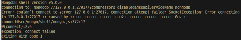 왜인지는 모르겠지만 에러 원인도 다 깨져서 나와서 에러에 관해 찾기가 굉장히 애매했다. 그래서 cannot connect to the mongodb at localhost 27017로 구글링을 해보니 방법은 굉장히 많았는데, 나는 다음과 같은 방법으로 해결했다.